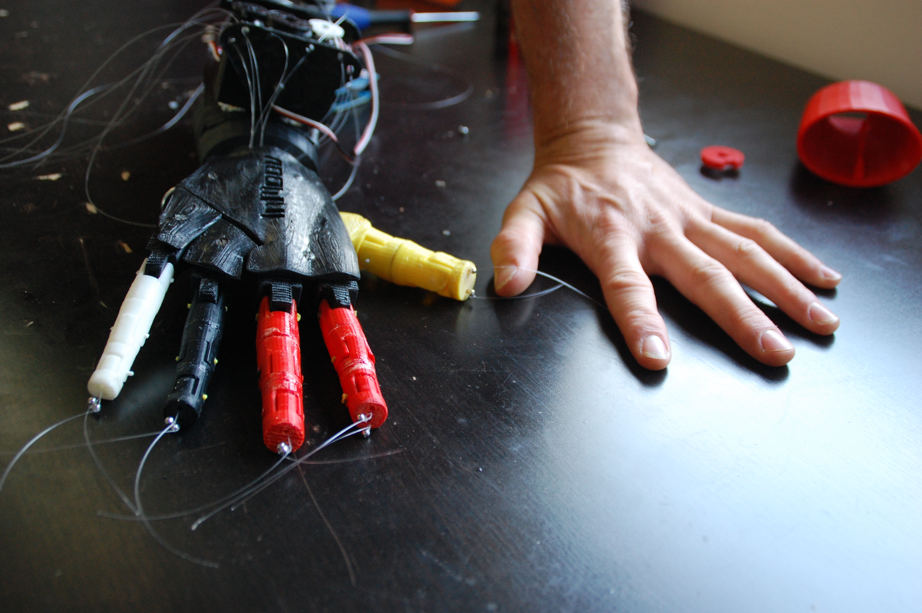 Et voila le résultat! Le prochain objectif, c’est le mouvement des doigts, le codage et l’alimentation électrique de tout ce bazar. C’est la mission de Sami qui s’investit de plus en plus, et nous allons ensemble à la MakerFaire de Rome présenter le projet début Octobre. Deux mains c’est la rentrée et je fête mon trentième!