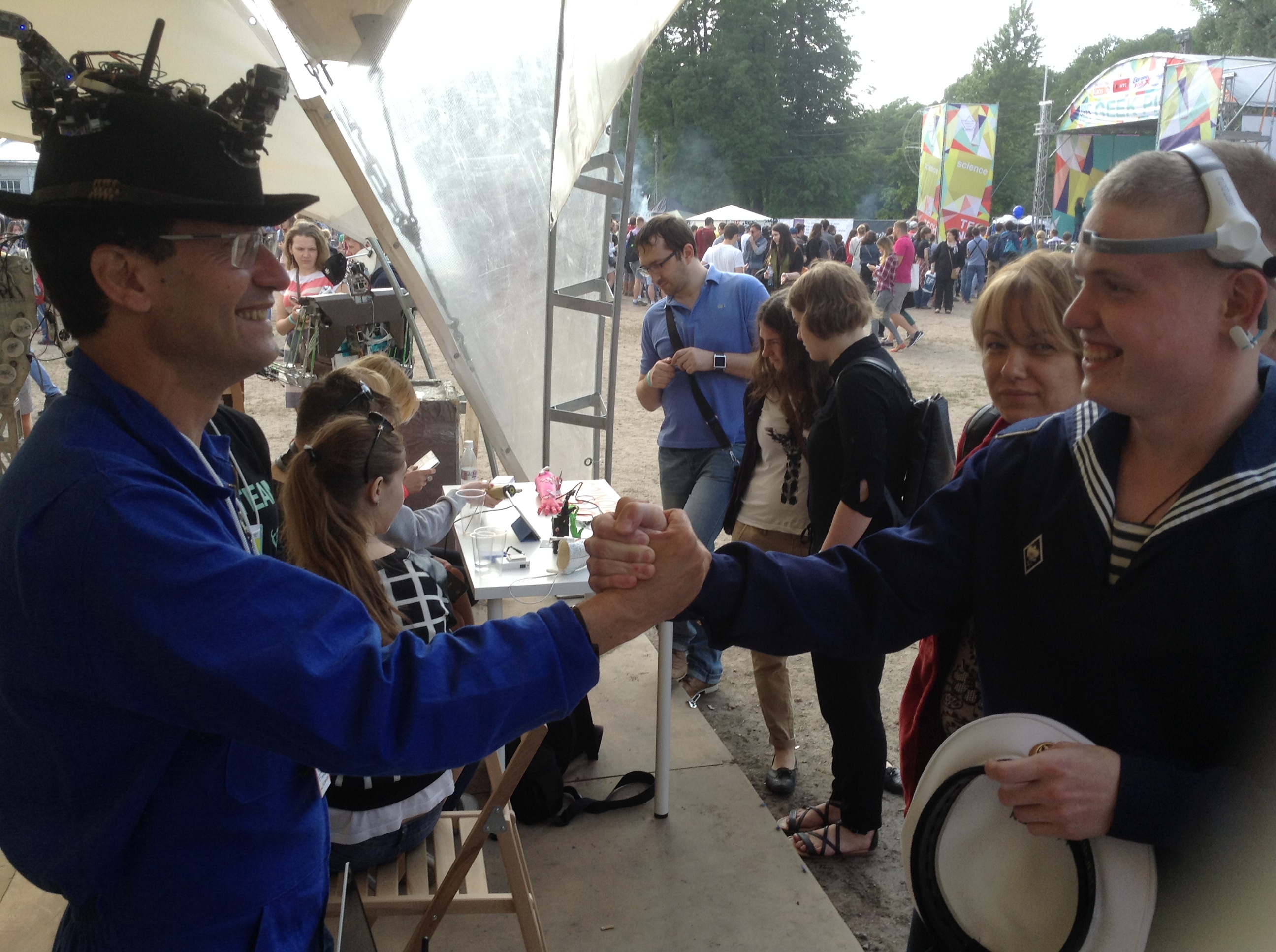 Hugobiwan « Frenchy » à gauche porte un chapeau avec des petits bras robots qui réagit suivant l’activité cérébrale récupérée par le casque placé sur la tête de son camarade marin Russe placé en face. C’est son invention et ça s’appelle le Mood Hat. Est-ce un début d’entente entre nos 2 pays? Cette poignée de main représente le peu d’importance que nous accordons aux informations parfois trop négatives à l’égard des pays étrangers.