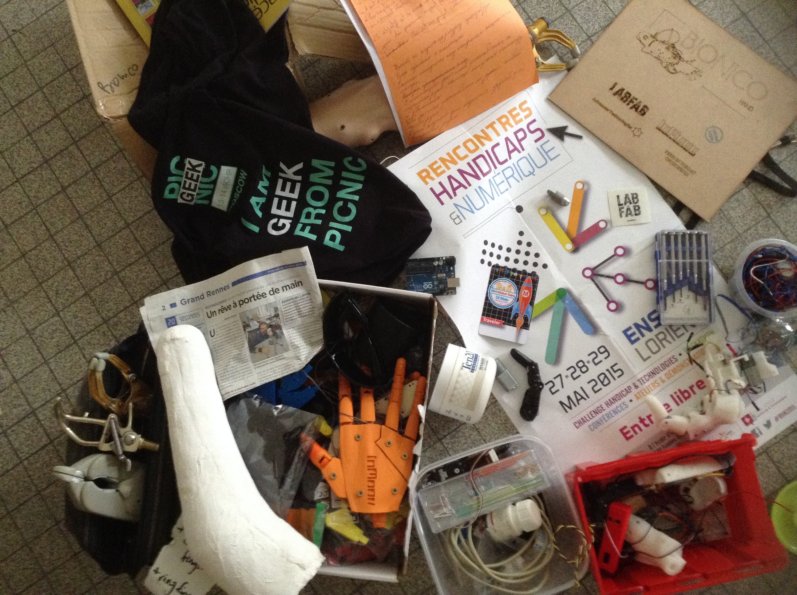 Ceci est un peu de bazar qui permet de résumé le projet: Rencontre Handicap et Numérique à Lorient, Maker Faire St Malo, Geek Picnic, fils, capteurs, mains robots, pince mécanique, tournevis, doigts qui traînent, crème conductrice, câble USB, carte électronique, emboiture, moulage en plâtre…