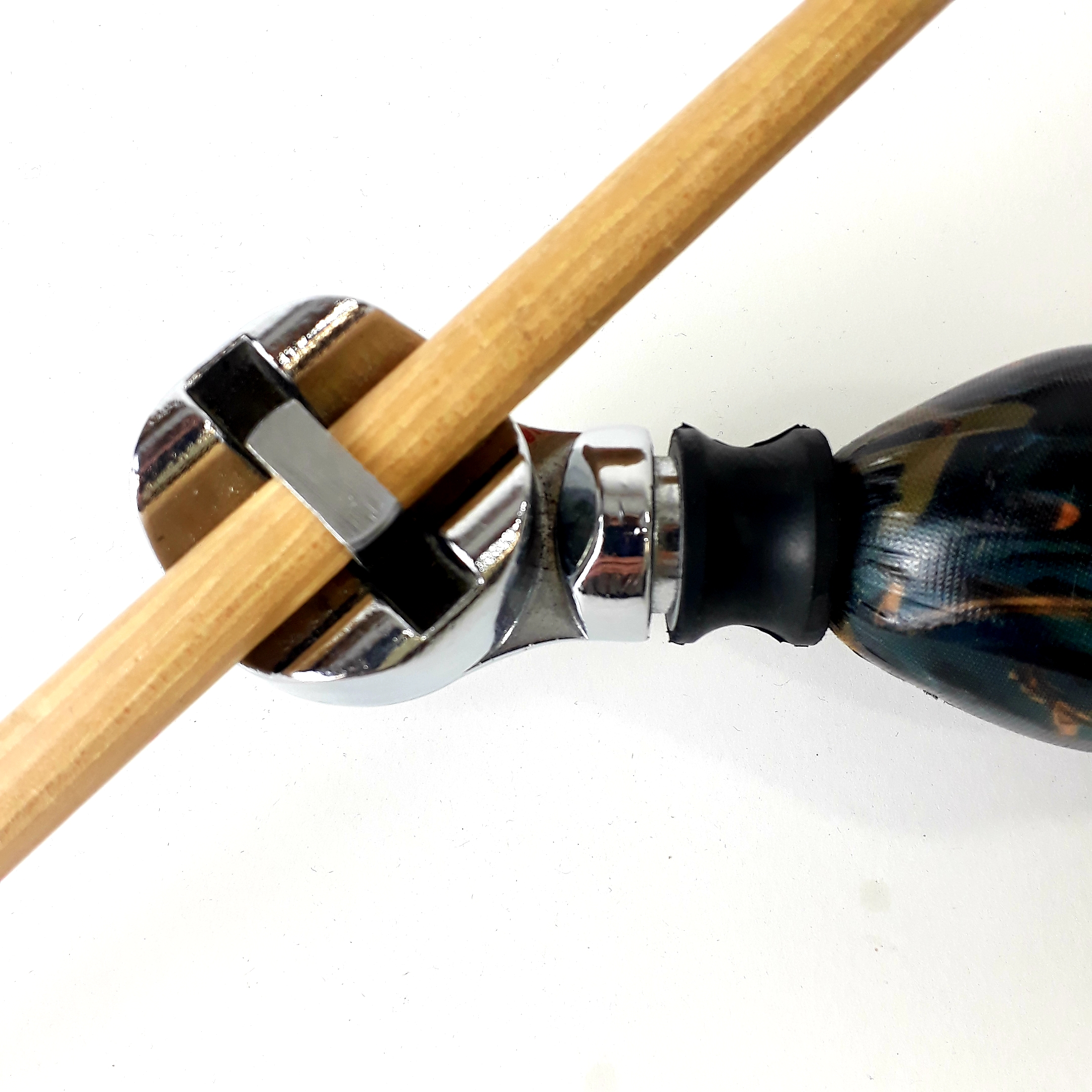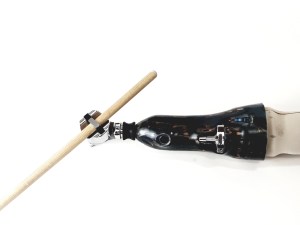 C’est à 18 ans, quand j’ai perdu ma main dans un accident de travail que je me suis dis : « Merde, t’es trop con t’aurais dû essayer, maintenant c’est trop tard! ». J’avais la vie devant moi pour regretter de ne pas avoir essayé quand je le pouvais. Et en en même temps, maintenant qu’il était trop tard et que la vie me paraissait nulle et inutile, je me disais, « Autant essayer, t’es pas mort ». J’en parle à mon prothésiste qui me bricole un système avec une baguette fixée sur une emboiture de prothèse, je m’achète une batterie électronique (Roland TD-6) et je prends des cours pendant six mois. J’apprends des rythmes latino comme la salsa ou samba, je ne sais pas lire la musique, mais le prof me conseil d’apprendre à l’Africaine vu que j’ai une bonne oreille, j’apprends vite dit-il. Le soir je m’entraîne au casque à la maison avec le métronome et je joue sur tous les styles proposé par la boîte à rythme : rock, reagge, ska, blues, funk, groove, slow…J’ai donc la preuve que je sais jouer. Cela se complique le jour ou j’essaie sur une batterie acoustique, comme je n’ai pas de poignet, la force de frappe est moindre et je ne peux pas gérer les rebonds. Grosse déception, je ne serais pas le batteur que je pensais, mais je cherche des solutions: une baguette sciée en deux est fixée sur une lame de carbone ou collé dans un ressort, des systèmes fait maison avec le coffre de ma voiture comme atelier vu qu’il n’y a pas encore d’endroit publique pour aller bricoler (merci les fablabs!). Des systèmes plus ou moins foireux qui me font baisser les bras car ce n’est jamais solide, qu’il faut modifier la baguette et que le son de frappe est loin de l’original. Et en 2012, miracle, en discutant avec un batteur et un mécanicien, j’ai enfin une solution qui allie un amortisseur de type silent bloc visser sur le tilter de perchette de cymbale. Ces deux sons de cloches me permettent de trouver la bonne note, la frappe main gauche sonne (presque) comme celle de la droite, c’est l’harmonie totale. Mon copain ingé son (Lolo) qui a l’ouïe fine qui valide à l’orale : »- Je crois que cette fois ça y est, tu l’as ». Voici le tutoriel de fabrication du système. Et pour couronner le tout, mon prothésiste qui est vachement fort (Erwan OPR35) m’a fabriqué une emboîture spéciale dans laquelle je peux ranger une clé de serrage pour régler les toms, alors elle est pas belle la vie ?