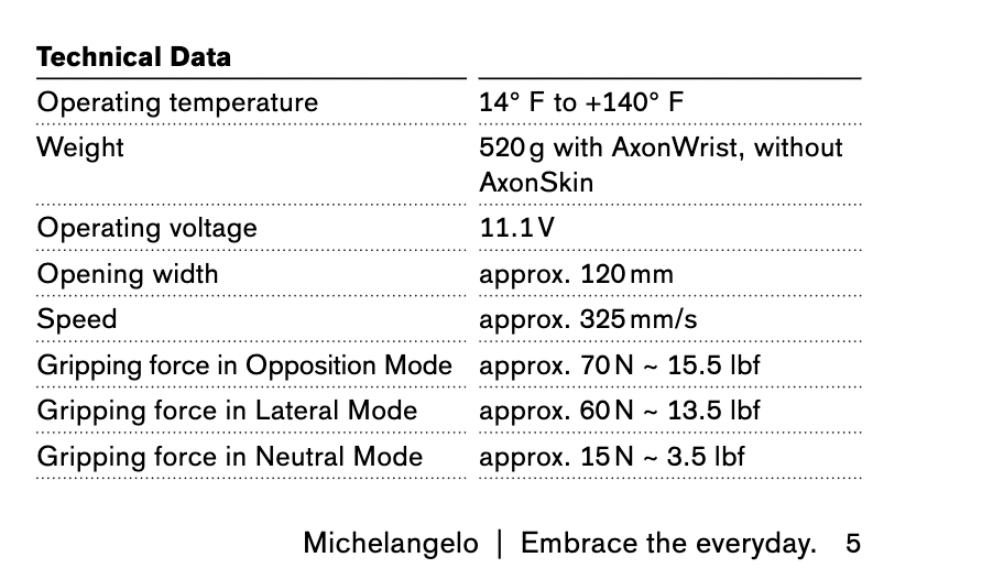 Les fabricants ont tendance à mettre en avant l’aspect technologique (connexion bluetooth, aspect robotique assumé) et la quantité d’options possibles avec les doigts (différentes prises, positions de doigts. En ce qui me concerne, ces options ne sont que secondaires, ce qui me paraît important est :
